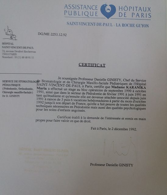 Πραγματοποίησε επίσης stage στο νοσοκομείο Robert Debre του Παρισιού πάνω στην οδοντιατρική μέθη.