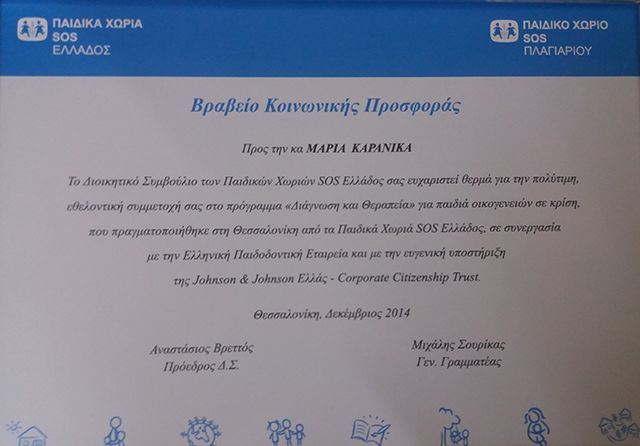 - Βράβευση από τα παιδικά χωριά S.O.S για την εθελοντική της δράση με την κινητή μονάδα «Φωτεινά χαμόγελα».