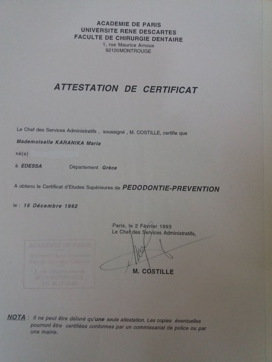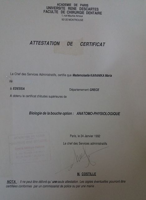- Ειδικευμένη στο πανεπιστήμιο Academie de Paris - Universite Rene Descartes, Paris V.