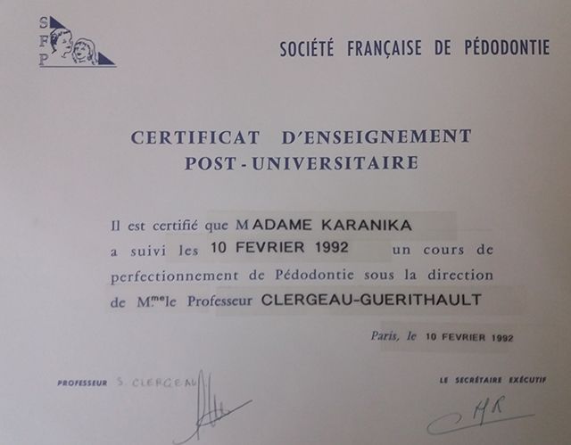 2) C.E.S. B στην Παιδοδοντία – Πρόληψη (μία από τους 2 επιτυχόντες τη χρονιά 1991-1992, σε σύνολο δεκάδων υποψηφίων).